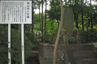 『 秋山夫人は甲斐の武田一族である秋山虎康の娘で、15才で徳川家康の側室となり、名を於都摩(おつま)の方または、下山の局と称され、家康の第5子万千代君を生んだ。万千代君は後に、武田信吉を名のり天正18年(1590)に、小金城三万石に封ぜられた。秋山夫人はその翌19年10月6日、小金で病死した。現在の墓石は信吉の甥、徳川光圀(水戸光圀)が貞享元年(1684)に建立したものである。』