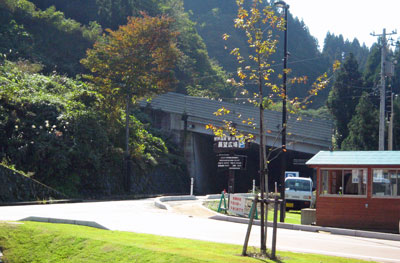 国道沿いの駐車場にあるエレベータです。これで下へ降りて菅沼集落へ向かいます。