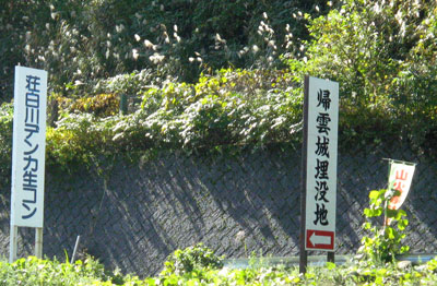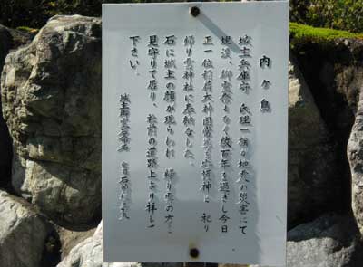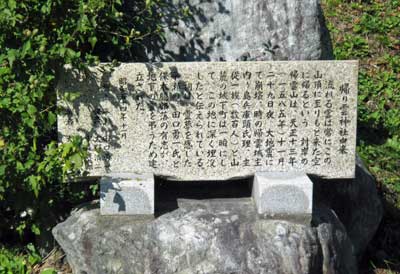 『 城主兵庫守、氏理一族が地震の災害にて埋没、御霊祭もなく数百年を過ぎし今日、正一位稲荷大神国常尊を守護神と祀り、帰り雲神社に奉納なした。石に城主の顔が現らわれ、帰り雲の方を見守りて居り、社前の道路上より拝して下さい。』
