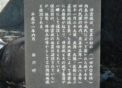 『 帰雲城は、寛正の初め(1460年頃)内島上野介為氏によって築かれた城である。四代氏理の時代、天正13年(1585年)旧11月29日、東海・北陸・近畿に及ぶ広範の地域を襲った巨大地震によって帰雲山に大崩壊が起こり、帰雲城とその城下集落が一瞬にして埋没したと伝えられている。埋没前の、帰雲城の位置は確認されていないが、地勢・堆積土砂等からしてこの周辺地域と推測される。