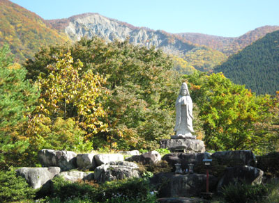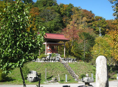 『 流れる雲は常にこの山頂に至りもと来た空に帰るという。対岸の帰雲山は、天正13年(1585年)11月29日夜、大地震にて崩壊、時の帰雲城主内ヶ島兵庫頭氏理、主従一族(数百人)と山麓の城下町は一瞬にして、このり地に深く埋没したと伝えられている。祠は、霊夢を感じた平瀬の田口勇一氏と保木脇部落の有志が、地下の霊を弔うため建立された。』