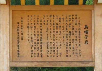 『 ここ牧ヶ洞集落は、その昔、中世の頃は七森、七郷と呼ばれていた時代があり、各郷には、時の豪族が広い耕地や山林、牧場などを領有し、多くの作人を養い、独自の氏神を祀り競い合って住んでいました。殿村の杜もその一つであり、近くには「鳥帽子岩」といわれる巨岩があり土豪を始め氏子たちに崇拝され親しまれてきました。そこにはいまも「ゑほし岩」と言う字名も残されています。