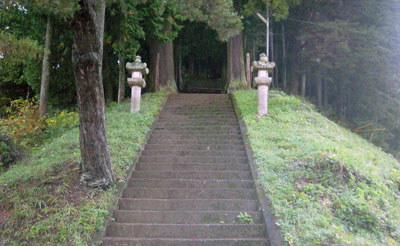 日輪神社への階段から鳥居方向を見た風景。鳥居からちょっと坂道を登っています。