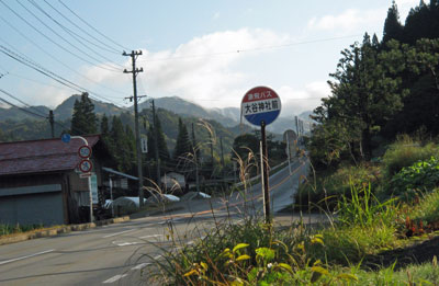 鳥居の横にあるバス停です。バス停の名前は「大谷神社前」で、日輪神社前ではありません。注意。