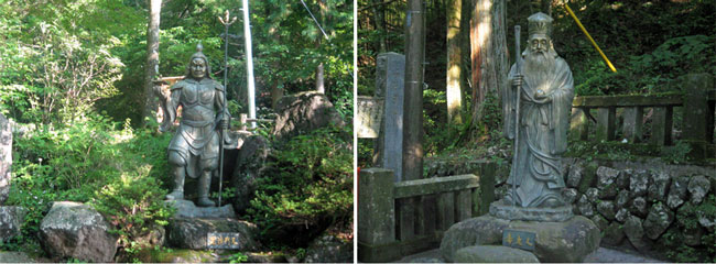 参道の所々に七福神の像があり、随神門の隣には毘沙門天が(右)、随神門を入ったところにある禊橋のたもとには寿老人(左)がいました。
