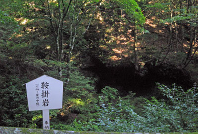 みそぎ橋を渡った川の向こうにある鞍掛岩。「くらかけ」とは岩鞍が欠け落ちたことに由来する名称ではないかと言われているそうです。