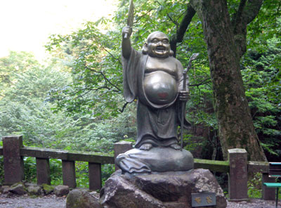 最初の坂道をのぼりきると布袋様がいました。トレードマークの布袋の上に乗っています。