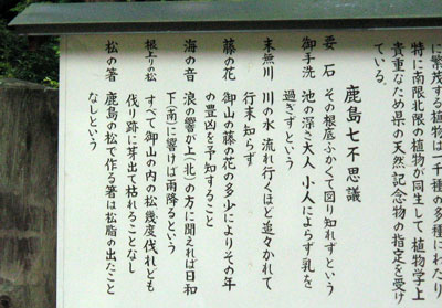『 鹿島神宮境内約七○ヘクタール(七○町歩)に繁茂する植物は一千種の多種にわたり、特に南限北限の植物が同生して植物学上貴重なため県の天然記念物の指定を受けている。』