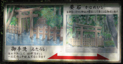 『 古来、神職並びに参拝者の潔斎の池である。池の水は清く美しく澄み、四時滾々と流れ出てどのような旱魃にも絶えることのない霊泉で、神代の昔御祭神が天曲弓で掘られたとも、宮造りの折一夜にして湧出したとも伝えられ、大人子供によらず水位が乳を越えないという伝説により七不思議の一つに数えられている。大昔は当神社の参道がこの御手洗池を起点として、この池で身を清めてから参拝するので御手洗(みたらし)の名が今に残るのである。』