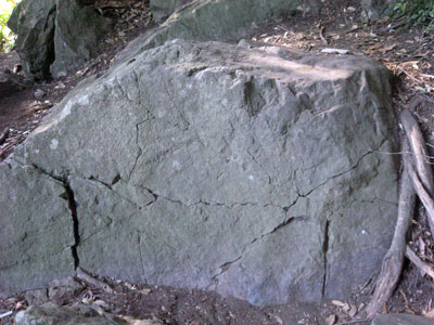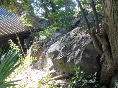 時々、このタイプの巨石を神社やパワースポットで見かけますが、この巨石はコンクリートなのではないかと・・・(同じく左は拝殿の屋根)