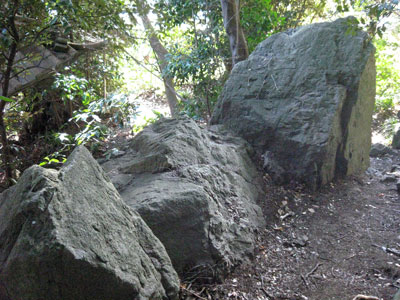 こういう巨石がゴロゴロ積まれてるわけですが・・・(左は拝殿の屋根)