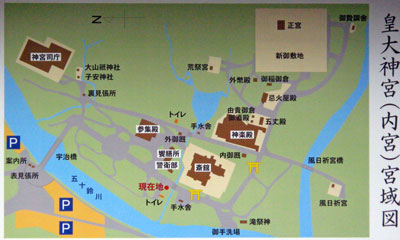 この橋から向こう側が本当の神域で、ここから先は皇族でも下車しなければならないようです。橋の向こうの右手に宮域図がありました。