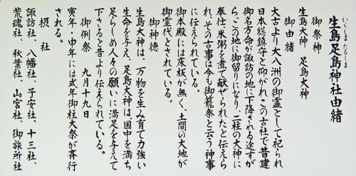 『 生島大神は、万物を生み育て力強い生命を与え、足島大神は、国中を満ち足らしめ人々の願いに満足を与えて下さると昔より伝えられている。』