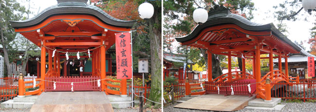 神楽殿側から見た御神橋(左)、神島側から見た御神橋(右)