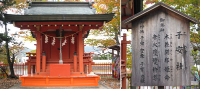 橋を渡ると左手に末社の子安社が鎮座していました。祭神は木花開耶姫命と彦火瓊瓊杵尊です。