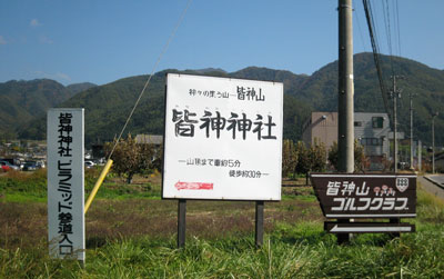 よく本で見かける看板です。皆神山の山頂まで車約5分、徒歩約30分。