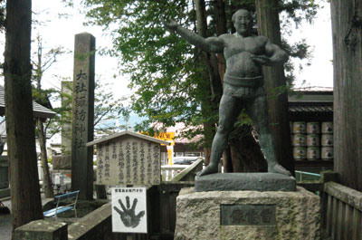 − 雷電為右衛門の像 − 『幕末に信州東部町が生んだ名力士で、氏子出身の彫刻家故矢崎虎夫氏の文部大臣賞受賞作品。モデルは横綱柏戸と佐田山及富士錦。勝負に強い御神徳の當大社に奉納されました。』 (案内板より)
