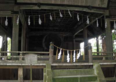 『文政10年(1828)の建立で祈願者の神楽奉納の御殿である。四方吹通し入母屋造りで諏訪市の指定文化財の建造物です。大太鼓は神楽殿建立と同時に奉納され胴は樽と同様に合わせ木作りで龍神が画かれている。皮は一枚皮が使われ、一枚皮では(牛と云う)日本一と云われる。この大太鼓は元旦の朝のみ打たれる。』