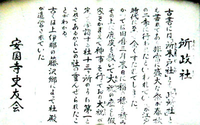『古書には「所末戸社」とも「政所社」とも書かれてあり非常に盛大な祭りが春秋の二季に行われたといわれているが江戸時代に至って全く廃れてしまった。かつては旧暦三月末日に稲の穂を積みその上に鹿皮を敷いて大祝の座とし假家をかまえて神事を行っており、大祝が定めで参詣する社十三ヶ所のうち第一とされてあるからこの社の重んぜられたことがわかる。古くは上伊那の藤沢郷によって社殿が造営されていた。』