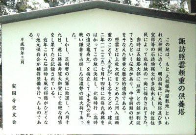 照雲とは上社大祝をつとめた三河入道頼重のことで「太平記」にも名をとどめ、建武2年(1335)7月14日に北條氏再興をはかってこの地に決起し、北條時行(高時の遺児亀寿丸)を擁立して「中先代の乱」を戦い鎌倉を占拠した信濃勢の総大将であった。しかし、足利勢の大軍に敗退し、8月19日、遂に勝長寿院大御堂にて壮絶な自害をし果てたと記録されている。近年これら石造物も風化損傷がひどくなり地元保存会が補修整備を行ったものである。』