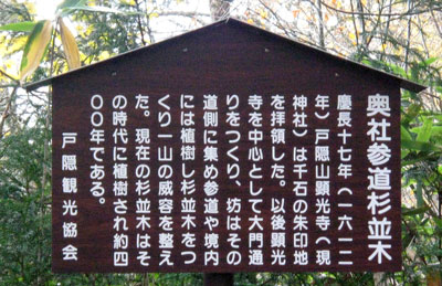 幕府から領地を拝領した戸隠山顕光寺(現・戸隠奥社)は奥社を中心に大門通りをつくり、その道側に坊を集め、参道や境内には植樹し杉並木をつくり、一山の威容を整えた、とあります。