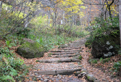 奥社まで480メートルという立て札を過ぎると、平らだった参道に少しデコボコが出現するようになり、そしてついに段々が出現。