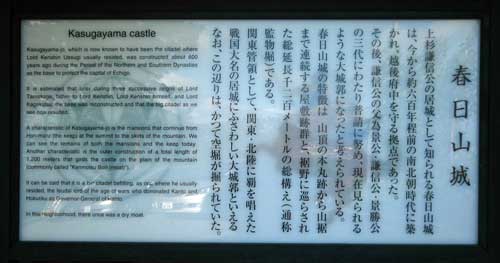 『上杉謙信公の居城として知られる春日山城は、今から約600年程度前の南北朝時代に築かれ、越後府中を守る拠点であった。その後、謙信公の父為景公・謙信公・景勝公の三代にわたり普請に努め、現在見られるような大城郭になったと考えられている。春日山城の特徴は、山頂の本丸跡から山裾まで連続する屋敷跡群と、裾野に巡らされた総延長1200メートルの総構え(通称監物堀)である。関東管領として、関東・北陸に覇を唱えた戦国大名の居城にふさわしい大城郭といえる。なお、この辺りは、かつて空堀が掘られていた。』