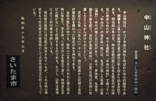 『 中山神社は、かつて中氷川神社と呼ばれた中川の鎮守である。創建を人皇十代崇神天皇の御代二年と伝えられる古社である。明治四十年七月、神社合祀の際に社名を現在の中山神社に改められたが、今でも通称は「中氷川神社」で通っている。