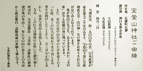 『 このお宮には第十二代景行天皇の皇子の日本武尊がお祀りされています。東国平定の折、この山の神秘な雰囲気と美しい姿に心ひかれた尊は、艱難辛苦の末山頂に立たれ、この地を祀るに相応しいところとされ、宝登山神社の礎とされました。
