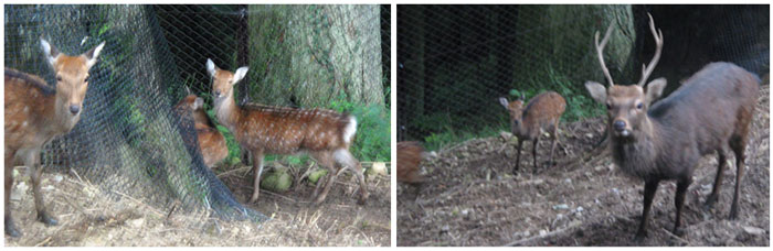 階段を登っていると、突然キュ〜〜ンとカワイイ鳴き声が! 階段横の傾斜に柵があり鹿が飼われてました。ここの鹿は元気に走り回っていて、呼ぶと一瞬こっちを向いて止まるのですが、すぐに動き出してピンボケ・・