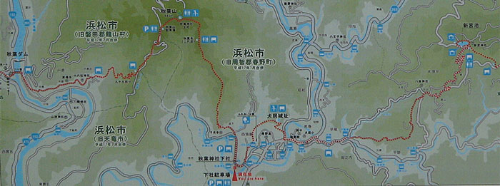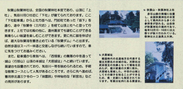 『 秋葉山秋葉神社は、全国の秋葉神社本宮であり、山頂に上社、気田川河口付近に下社が建てられております。ここ下社駐車場から上社方面へは、門前町であった坂下を通り、途中「秋葉寺(三尺坊)」を経て山頂上社へと登って行きます。上社では社殿の他に、遠州灘までも望むことができる素晴らしい眺望を楽しむことができます。』