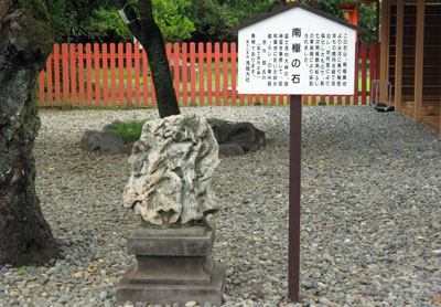 『明治以前の春秋の大祭では、神霊を宿した鉾が本宮と山宮の間を往復したが、その神幸の途中の休息時に神鉾を安置した石。現存するのは、本宮楼門前の1基と山宮浅間神社参道の2基。』
