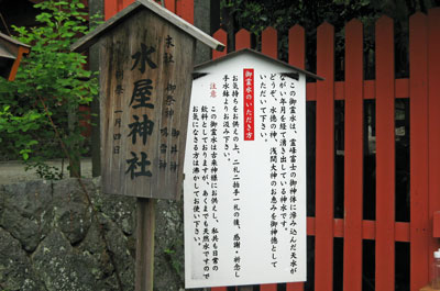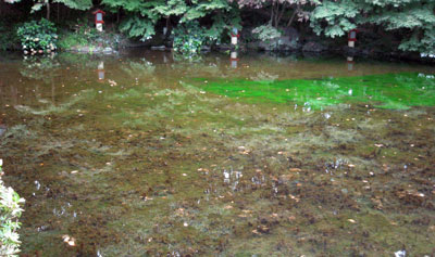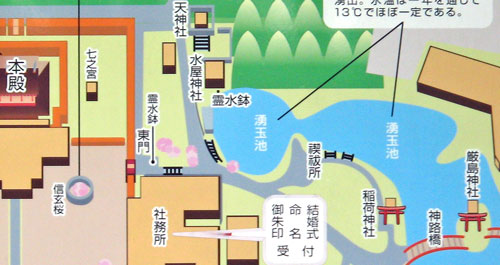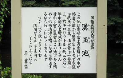 − 国指定特別天然記念物 湧玉池(わくたまいけ) − 『 この池は霊峰富士の雪解け水が溶岩の間から湧き出るもので水温は摂氏十三度、湧水量は一秒間に三、六キロリットル(約二〇石)年中殆んど増減がありません。昔から富士道者はこの池で身を清めて六根清浄を唱えながら登山するならわしになっております。 つかふべき数にをとらむ 浅間なる御手洗川の そこにわくたま 平兼盛 』