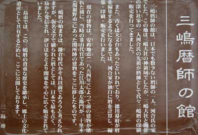 『 三嶋暦師の館は、日本でも数少ない暦師の一人、河合氏の家でした。この地は三嶋大社の領地でしたが、三嶋大社と関係の深い社家の一人河合氏の先祖が暦師として代々三嶋暦の印刷・販売を行ってきました。また古くは天文台もあったといわれており、徳川幕府が暦を編集するようになるまでは、河合家が独自に暦を計算し、編集・印刷・販売を行いました。現在の建物は、安政地震(1854年)によって前の建物が壊れた後に、当時の韮山代官であった江川太郎左衛門が、十里木(現裾野市)にあった関所跡の建物をここに移したものです。