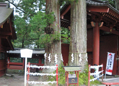 神門を入った右手にある夫婦杉。根を一つにした夫婦円満の御神木で、祭神は大己貴命と田心姫命。