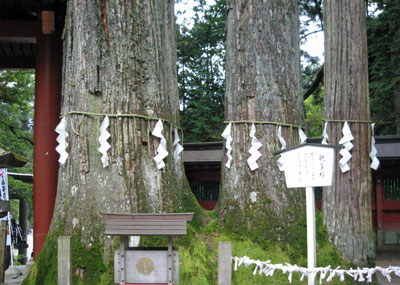 神門を入った左手にある親子杉。根を一つにした三本杉で、祭神三柱に因み、家庭円満の親子杉と言うそうです。