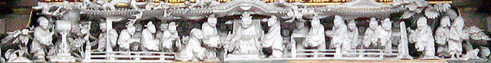 唐門の上部には「舜帝朝見の儀」が彫られています。 中央にいるのは中国の伝説上の皇帝「舜帝」で、舜帝は尭帝とともに最も理想の聖人とされる聖天子で、日本の平成という元号は舜帝の「内平外成」の言葉から選ばれています。