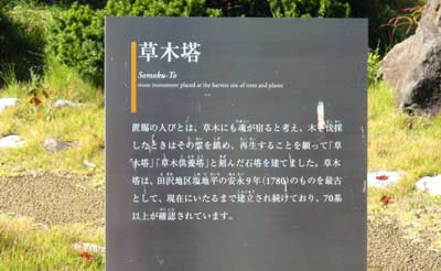 『置賜の人びとは、草木にも魂が宿ると考え、木を伐採したときはその霊を鎮め、再生することを願って「草木塔」「草木供養塔」と刻んだ石塔を建てました。草木塔は、田沢地区塩地平の安永9年(1780)のものを最古として、現在にいたるまで建立され続けており、70基以上が確認されています。』