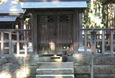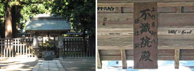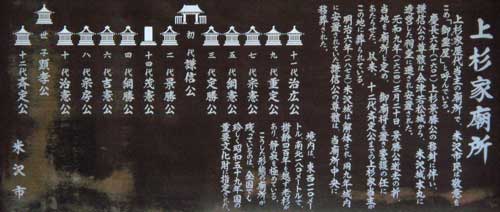 『上杉家歴代藩主の廟所で、藩祖謙信公の廟を中央にして、その両側に12代までの藩主の廟が並んでいます。廟は、2代から8代までは社造りで、材質もケヤキを用い、柱は丸柱となっています。9代から12代までの廟は、10柱と簡素になり、藩の財政事情がうかがわれます。